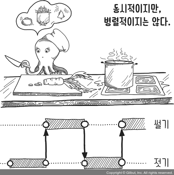 상황을 보면 알겠지만, 우리가 가진 처리 자원(요리사)은 하나뿐이다. 처리 자원의 동시성은 전적으로 처리 자원의 이동에 달려 있다. 동시성을 갖추지 못하면 요리사는 수프를 다 끓인 다음에야 샐러드 재료를 썰 수 있다.