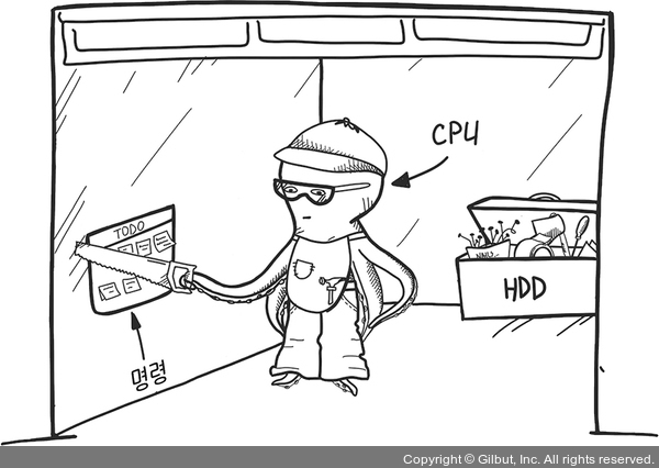 목수가 한 명뿐인 목공소를 생각해보자. 목수(CPU)는 쏟아져 들어오는 고객의 주문(명령)을 수행해야 한다. 고객이 주문한 제품을 만들기 위해 목수는 작업에 필요한 목재와 재료를 두는 임시 보관소를 가까이에 만들어 매번 창고(하드 디스크)에 목재와 재료를 가지러 가는 수고를 던다.