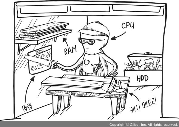 목공소 예제로 돌아가서, 임시 저장소를 두었지만 목수는 필요한 도구를 언제나 손이 닿을 만큼 가까운 곳에 두고 싶어한다. 그래서 도구를 작업대에 보관하기로 한다. 캐시 메모리는 CPU의 작업대와 같은 역할을 한다.