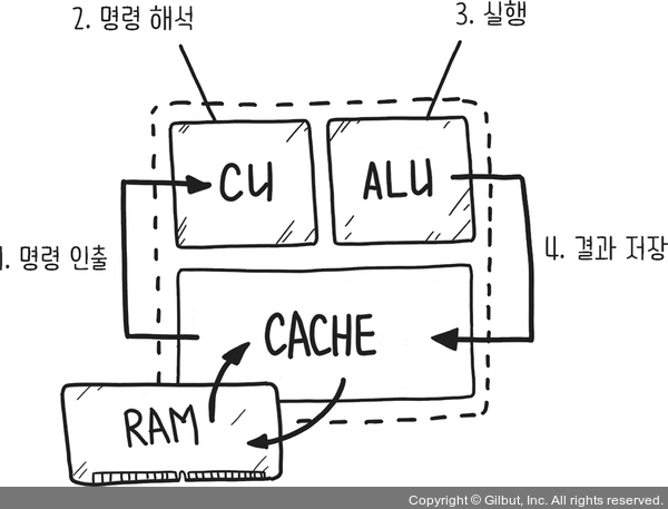 CPU가 명령을 실행하는 과정도 이와 비슷하게 여러 단계를 거친다. 이러한 일련의 단계를 CPU 사이클(CPU cycle)이라고 한다. 최대한 단순하게 요약하면 CPU (실행) 사이클은 네 단계를 거친다.