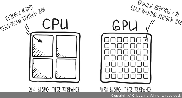 다양한 인스트럭션이 있고 클록 속도가 빠른 만큼 각 코어는 CPU가 더 빠르지만, GPU의 코어 숫자에서 오는 대규모 병렬성의 힘이 인스트럭션의 단순성과 부족한 클록 속도를 메우고도 남는다. 그래서 CPU는 복잡하고 선형적인 작업에 적합하다.