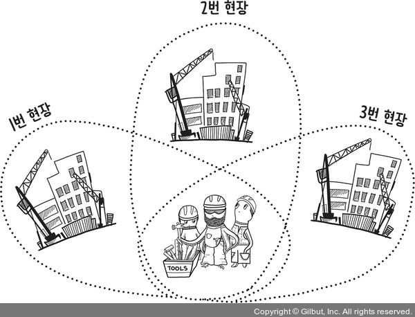 이 예제는 프로세스와 비슷한 구도다. 각각의 건설팀(프로세스에 해당)은 전용 공구와 설계도, 자원으로 전담 건설 현장(작업)에서 근무한다. 반면 예산을 절약하기 위해 모든 건설 현장에서 근무할 건설팀 하나만 고용하는 경우도 생각할 수 있다. 모든 건설 현장에서 공구와 자원이 공유되지만, 건설 현장마다 도면(인스트럭션의 목록)은 다를 것이다. 이러한 구도가 스레드와 같다.