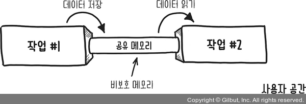 그러나 공유 메모리의 ‘저주’는 안전한 정보 교환이 어렵다는 점이다. 운영체제가 정보 교환 과정에 개입하지 않는 만큼 인터페이스나 공유 메모리의 보호도 제공하지 않는다. 예를 들어 남은 맥주가 한 병뿐인 상태에서 맥주를 마시고 싶은 사람은 두 명인 상황을 생각해보라. 충돌(가끔은 전쟁이 되기도 한다)이 발생한 상황이다.