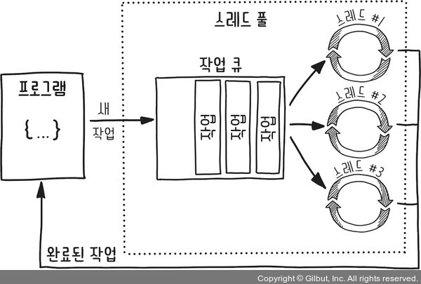 스레드 풀과 스레드 간의 정보 교환은 메시지 큐에 맡기면 된다. 작업 목록이 담긴 메시지 큐가 있고, 풀에 담긴 스레드가 이 메시지 큐에서 작업을 하나씩 꺼내 동시적으로 처리하는 구조다.