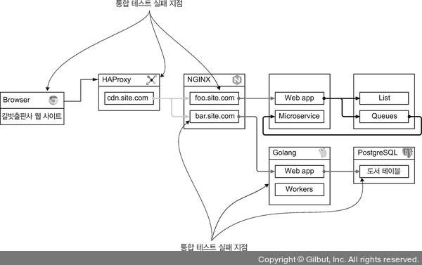 ▲ 그림 1-7 통합 테스트는 하나라도 실패하면 제대로 된 결과를 얻을 수 없다, 여러 기능이 연쇄적으로 작용하기 때문에 버그 원인을 찾는 것도 쉽지 않다