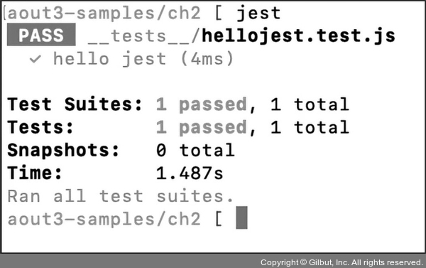 그림 2-3을 보면, 이 테스트를 실행하는 데 1.487초가 걸린 것을 알 수 있다. jest --watch 명령어를 사용하면, 제스트가 파일 변화를 감지하고 변경된 파일에 대한 테스트를 자동으로 실행한다. 이렇게 하면 매번 제스트를 재실행할 필요가 없어 매 실행마다 걸리는 내부적인 초기화 작업을 건너뛰게 되며, 테스트가 많아지면 상당한 시간을 절약할 수 있다. 즉, 지속적인 테스트 프로세스에 큰 도움이 된다. 터미널을 하나 더 열어 jest --watch 명령어를 실행해 두면, 코딩을 계속하면서 테스트가 실시간으로 통과하는지 실패하는지 알 수 있다. 이는 작업 흐름을 이해할 수 있는 좋은 방법이다.