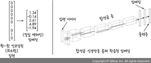 ▲ 그림 1-1 입력에 사용되는 임베딩(왼쪽)과 신경망으로부터 얻은 임베딩(오른쪽)