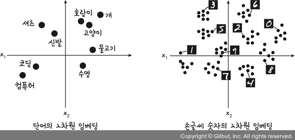 ▲ 그림 1-2 2차원 특성 공간(feature space)에 매핑된 단어(왼쪽)와 이미지(오른쪽)