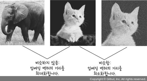 이 그림에서 조작된 고양이 이미지는 여전히 같은 고양이이므로 신경망이 비슷한 임베딩 벡터를 만들어야 합니다. 또한 훈련 세트(training set)에서 랜덤하게 이미지를 선택할 수있습니다(예를 들어 코끼리. 하지만 신경망은 이 레이블도 알지 못합니다).