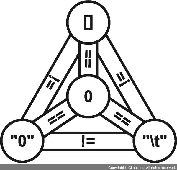동등성과 동일성의 문제는 숙련된 많은 프로그래머를 당황하게 했습니다. 커먼 리스프(Common Lisp) 개발자는 eq, equal, eql, equalp를 구분하여 사용합니다. 스킴(Scheme)에서는 =, eqv?, equal?만 사용합니다. JavaScript에서는 동등성이 전이성을 가지지 않는 것으로 유명합니다. 그림 2-1에서 신학적 삼위일체로 표현되는 JavaScript의 유명한 그림은 전이성이 확보된 파이썬이 상대적으로 얼마나 합리적인지 보여 줍니다. 물론 의도적으로 이를 무시하는 사용자 정의 클래스를 작성할 수 있으며, 이는 공포스러운 결과를 만들어낼 수도 있습니다.
