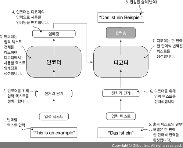 ▲ 그림 1-4 언어 번역을 위한 딥러닝 모델인 원본 트랜스포머 구조를 간소화한 그림. 트랜스포머는 두 부분으로 구성됩니다. (a) 인코더는 입력 텍스트를 처리하여 텍스트의 임베딩(embedding) 표현(각각의 차원에서 서로 다른 요소를 포착하는 수치 표현)을 생성합니다. (b) 디코더는 한 번에 한 단어씩 번역된 텍스트를 생성합니다. 이 그림은 원본 입력 텍스트(“This is an example”)와 일부 번역 문장(“Das ist ein”)이 주어졌을 때 디코더가 이 번역을 완성하기 위해 마지막 단어(“Beispiel”)만 생성하는 마지막 번역 단계를 보여 줍니다.
