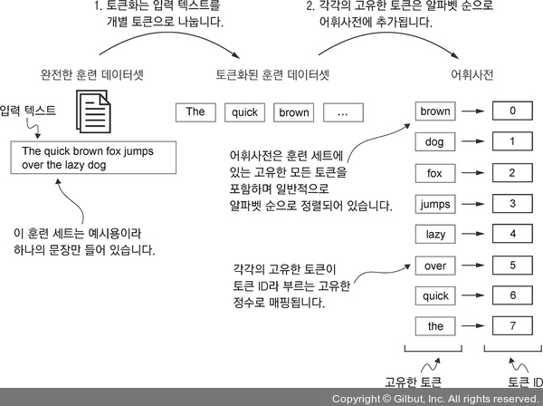 ▲ 그림 2-6 훈련 세트에 있는 모든 텍스트를 개별 토큰으로 토큰화하여 어휘사전을 구축합니다. 이런 개별 토큰은 알파벳 순서로 정렬되어 있으며 중복된 토큰은 삭제됩니다. 그런 다음 어휘사전에 추가된 각각의 고유한 토큰을 정수 값으로 매핑합니다. 그림에 나온 어휘사전은 의도적으로 간결하게 나타내기 위해 작게 만들었고 구두점 문자나 특수 문자가 없습니다.