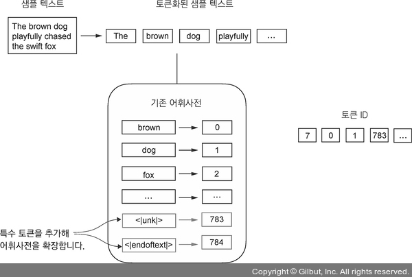 ▲ 그림 2-9 특수 문맥을 처리하기 위해 어휘사전에 특수 토큰을 추가합니다. 예를 들어, 훈련 데이터에 포함되어 있지 않아 기존의 어휘사전에 없는 새로운 단어를 나타내는 <|unk|> 토큰을 추가합니다. 또한 관련이 없는 2개의 텍스트를 구분하는 데 사용하는 <|endoftext|> 토큰을 추가합니다.