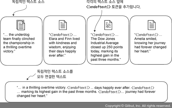 ▲ 그림 2-10 여러 개의 독립적인 텍스트 소스로 작업할 때 텍스트 사이에 <|endoftext|> 토큰을 추가합니다. <|endoftext|> 토큰은 특정 세그먼트의 시작 또는 끝을 알리는 일종의 마커(marker)로 작동하여, LLM이 텍스트를 보다 효과적으로 처리하고 이해할 수 있습니다.
