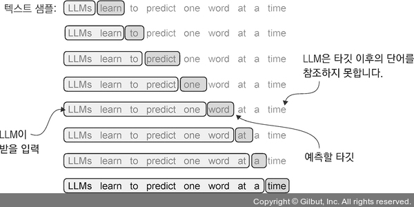 ▲ 그림 2-12 텍스트 샘플이 주어지면 LLM의 입력으로 제공할 부분 샘플을 위해 입력 블록을 추출합니다. 훈련 과정에서 LLM의 예측 작업은 입력 블록 다음에 오는 단어를 예측하는 것입니다. 훈련하는 동안 타깃 이후의 모든 단어를 마스킹(masking)합니다. 이 그림에 나타난 텍스트는 LLM이 처리하기 전에 토큰화를 거쳐야 하지만 그림을 이해하기 쉽도록 토큰화 단계를 생략했습니다.