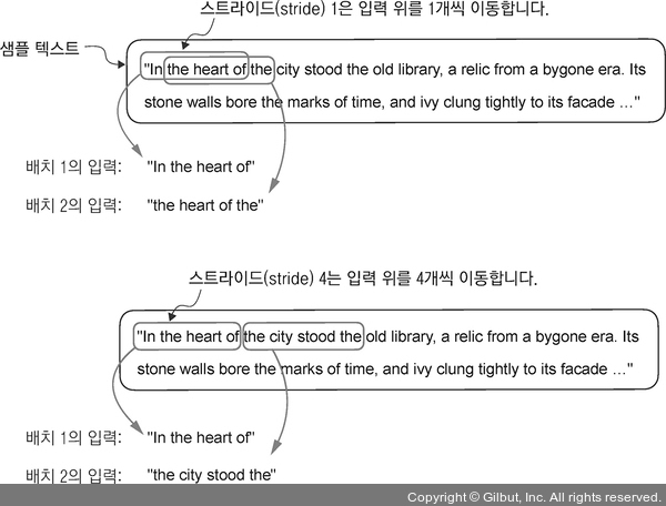 ▲ 그림 2-14 입력 데이터셋에서 여러 배치를 만들 때 입력 윈도로 텍스트 위를 슬라이딩합니다. 스트라이드가 1로 설정되면 입력 윈도를 한 토큰씩 이동하여 다음 배치를 만듭니다. 만약 스트라이드가 입력 윈도 크기와 같으면 배치 사이에 중첩되는 토큰이 없습니다.