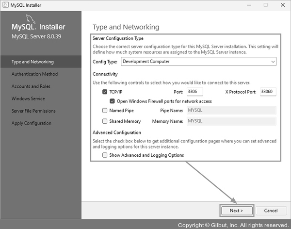 6 프로덕트 설정 화면에서 목록에 MySQL Server 8.0.39가 맞는지 확인하고 [Next] 버튼을 클릭합니다. 이어서 타입과 네트워킹은 기본 설정값 그대로 두고 [Next] 버튼을 클릭합니다.