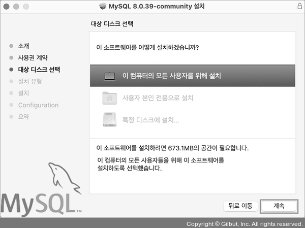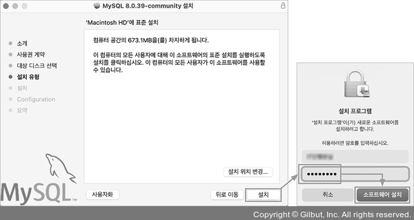 3 대상 디스크 선택은 기본 설정값 그대로 두고 [계속] 버튼을 클릭합니다. 설치 유형도 기본 설정값 그대로 두고 [설치] 버튼을 클릭합니다. 설치하기 위해 암호를 묻는 창이 뜨면 맥OS 컴퓨터의 암호를 입력하고 설치를 진행합니다.