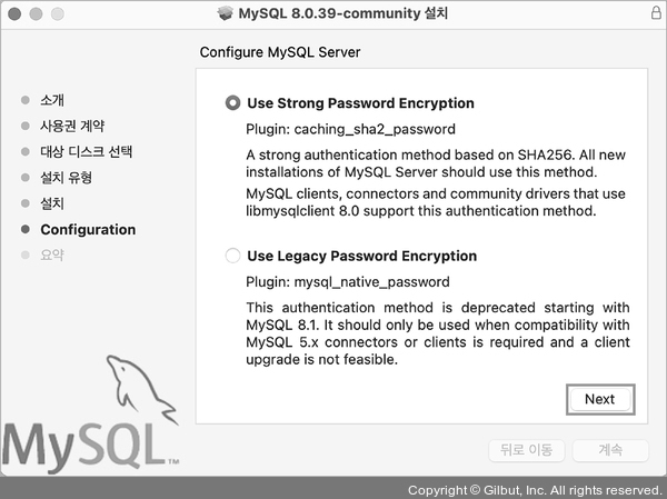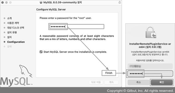 4 Configuration 화면에서 비밀번호 암호화 방식은 기본 설정값 그대로 두고 [Next] 버튼을 클릭합니다. MySQL 관리자(root) 계정의 비밀번호를 입력하라는 화면이 뜨면 학습용이므로 간단히 ‘mysql1234’를 입력하고 [Finish] 버튼을 클릭합니다. 맥OS 컴퓨터의 비밀번호를 입력하라는 창이 뜨면 비밀번호를 입력합니다.
