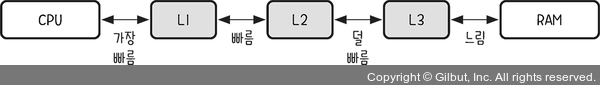 캐시는 CPU가 필요한 데이터를 미리 가져와 저장하는 방식으로 데이터 접근 속도를 높입니다. 하지만 제조 비용이 높기 때문에 RAM보다 용량이 작을 수밖에 없습니다.