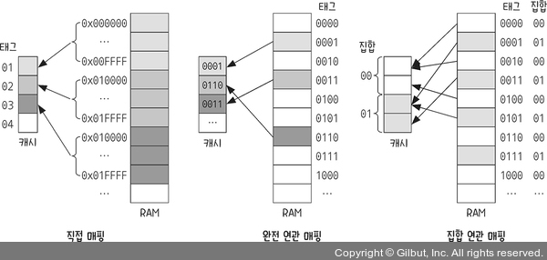• 집합 연관 매핑(set associative mapping): 직접 매핑과 완전 연관 매핑을 절충한 방식입니다. 캐시를 여러 집합(set)으로 나누고, 각 집합에서 완전 연관 매핑을 사용합니다. 데이터는 특정 집합에만 저장되며, 집합 내에서는 자유롭게 사용할 수 있습니다. 직접 매핑보다 충돌 문제가 줄어들고 히트율도 높지만, 여전히 충돌 가능성이 있고 직접 매핑보다 구현이 복잡합니다.
