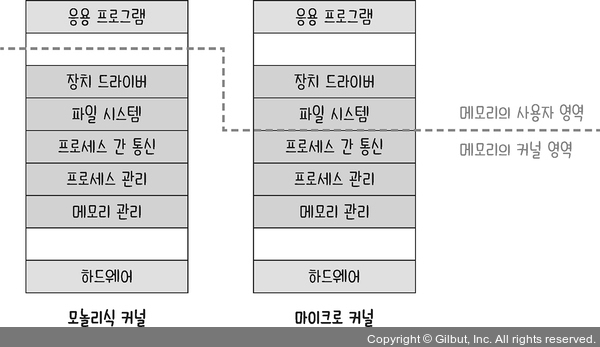 그림 7-2 모놀리식 커널과 마이크로 커널 비교
