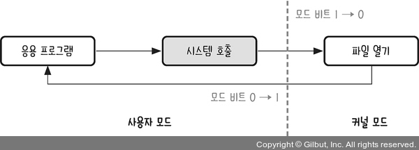 응용 프로그램이 시스템 호출을 요청하면 모드 비트가 0으로 바뀌면서 CPU를 사용자 모드에서 커널 모드로 전환합니다. 커널이 요청한 작업을 끝내면 모드 비트가 1로 바뀌고 CPU는 커널 모드에서 사용자 모드로 전환합니다.