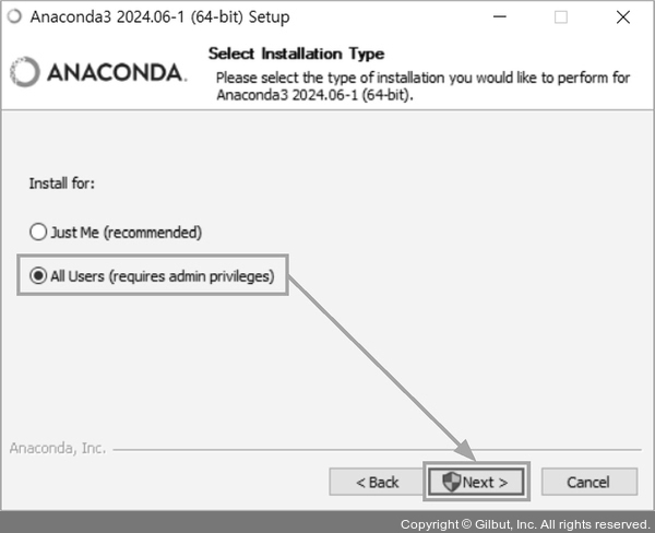 3 설치 타입 선택 화면에서 [Just Me] 또는 [All Users] 중 하나를 선택할 수 있습니다. [All Users]를 선택할 경우, 관리자 권한으로 실행해야 정상적으로 동작하니 유의하세요.