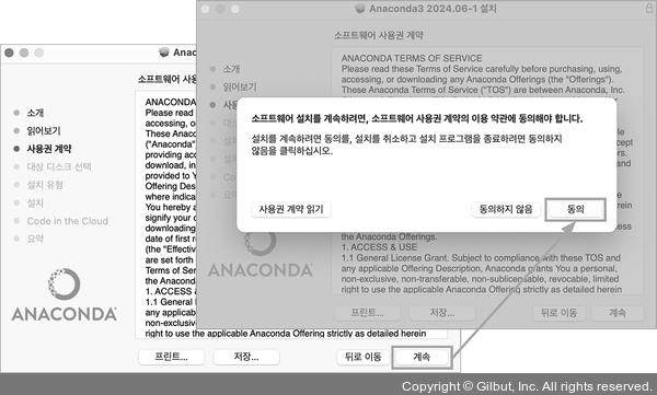 사용권 계약 화면에서 [계속] 버튼을 클릭합니다. 팝업창이 나타나면 [동의] 버튼을 클릭해 계약에 동의합니다.