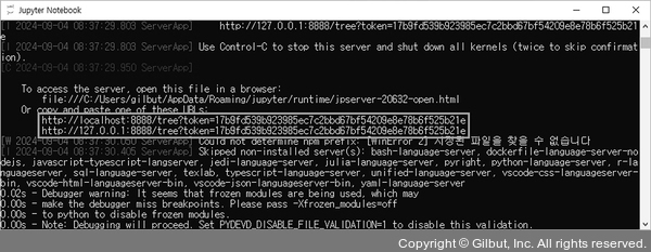 주피터 노트북을 실행하면 웹 브라우저에서 접근할 수 있는 URL이 터미널에 자동으로 생성됩니다. 터미널에 표시된 URL 중 하나를 복사해 웹 브라우저의 주소창에 입력하면 주피터 노트북 인터페이스가 열립니다.