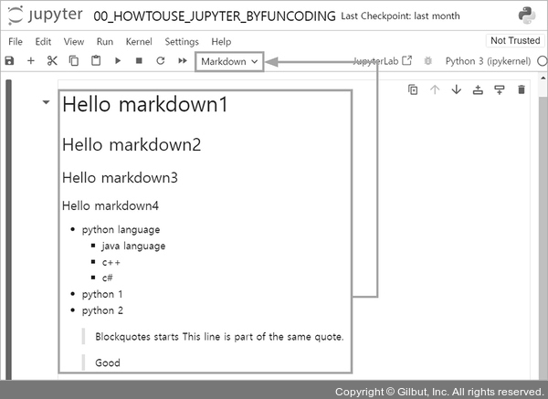 첫 번째 셀을 선택하면 상단 메뉴에 Markdown으로 표시됩니다. 이는 해당 셀이 마크다운 형식으로 작성되었음을 뜻합니다. 마크다운 셀을 더블 클릭하면 세부 내용을 수정하거나 확인할 수 있습니다. 셀에는 마크다운으로 텍스트를 작성하거나 파이썬 코드를 작성할 수 있습니다.