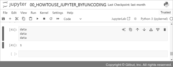 이 기능은 파이썬의 기본 문법이 아니라 주피터 노트북만의 기능입니다. VSCode나 파이참에서는 사용할 수 없습니다. 이 기능으로 변화하는 변수 값을 쉽게 확인할 수 있어 프로그래밍 입문자에게 도움이 됩니다. 특히 데이터 분석 작업에서는 변수에 저장된 데이터를 자주 확인하므로 이 기능이 매우 유용합니다. 단, 한 셀 안에 여러 변수명을 입력할 경우, 마지막 줄의 변수 값만 출력됩니다. 한 셀에 코드를 여러 줄 작성하고 싶을 때는 Enter를 누릅니다.