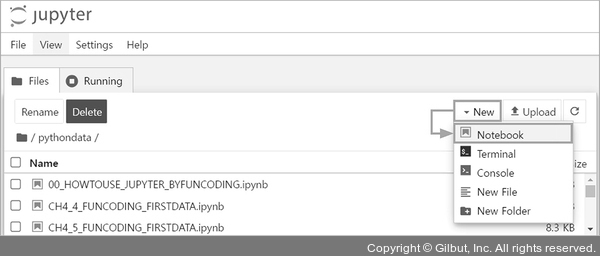주피터 노트북을 실행한 뒤 pythondata 폴더로 이동합니다. 오른쪽 상단의 [New] 버튼을 클릭하면 드롭다운 메뉴가 나타납니다. 여기에서 Notebook(또는 Python 3)을 선택합니다.