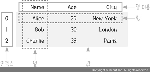 • 열(column): 데이터의 특성을 나타냅니다. 각 열은 고유한 이름을 가지며, 열 이름으로 특정 열에 접근할 수 있습니다. 그림 4-2에서 Name, Age, City는 각각 열의 이름입니다.