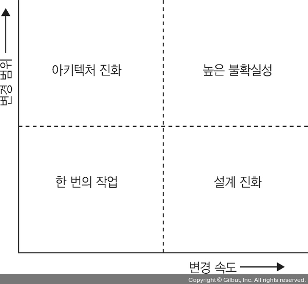 ▲ 그림 3-2 기능이 시스템에 미치는 영향은 예상되는 변경 범위(수직 축)와 변경 속도(수평 축)에 따라 분류될 수 있습니다, 각 사분면은 소프트웨어 제품에 대한 변경 압력에 아키텍처 팀이 어떻게 대응해야 하는지 나타냅니다