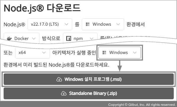 1 웹 브라우저에서 Node.js 다운로드 페이지(https://nodejs.org/ko/download)에 접속합니다. 페이지를 스크롤하면 하단에 설치 프로그램을 다운로드하는 버튼이 보입니다. 각자 운영체제에 맞게 설정한 후 버튼을 클릭하면 설치 파일을 내려받을 수 있습니다.