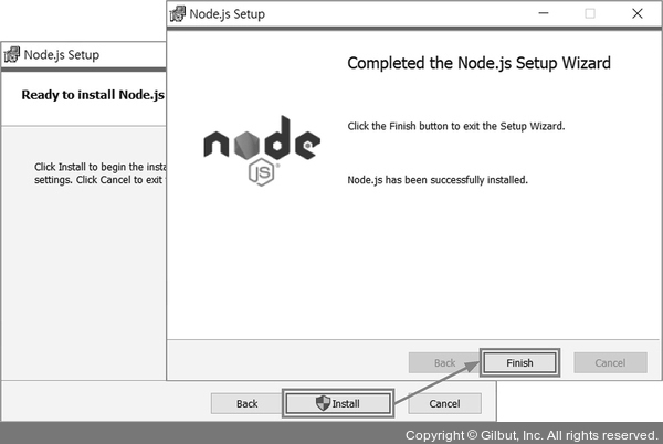 4 설치 준비가 완료되면 [Install] 버튼이 활성화됩니다. 이 버튼을 클릭하면 Node.js 설치를 시작하며, 몇 분 정도 시간이 걸릴 수 있습니다. 설치가 끝나면 설치 완료 화면이 나타납니다. [Finish] 버튼을 클릭해 설치 마법사를 종료합니다.