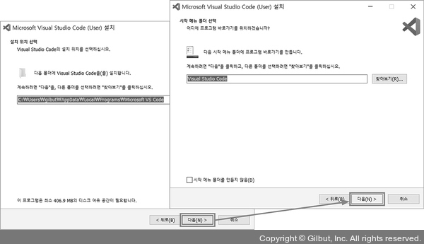 3 VSCode를 설치할 폴더 경로를 묻는 화면이 나타납니다. 변경하지 않고 기본값 그대로 [다음] 버튼을 클릭합니다. 시작 메뉴에 표시할 폴더 이름을 설정하는 화면이 나옵니다. 이 역시 기본값 그대로 두고 [다음] 버튼을 클릭합니다.