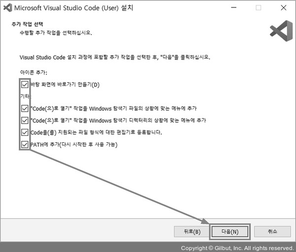 추가 작업 선택 화면이 나타나면 항목을 모두 체크한 후 [다음] 버튼을 클릭합니다.