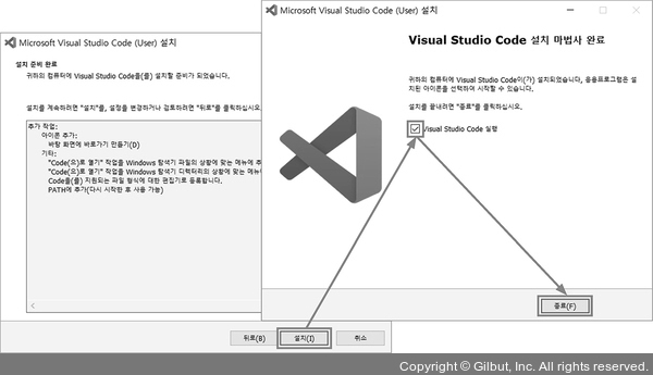 5 설치 준비 완료 화면에서 [설치] 버튼을 클릭합니다. 설치가 끝나면 Visual Studio Code 실행을 체크하고 [종료] 버튼을 클릭합니다.