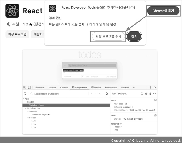 크롬 웹 스토어(https://chrome.google.com/webstore/category/extensions?hl=ko)에 접속해 상단 검색창에 React Developer Tools를 입력합니다. 검색 결과에서 가장 상단에 표시된 확장 프로그램을 클릭합니다. 상세 페이지에서 [Chrome에 추가] 버튼을 클릭합니다. 팝업 창이 뜨면 [확장 프로그램 추가] 버튼을 클릭해 설치합니다.
