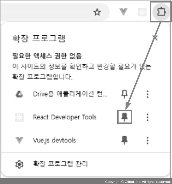 )을 클릭합니다. 확장 프로그램 목록에서 React Developer Tools 옆의 핀 아이콘(