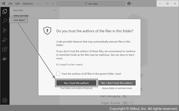 1 VSCode에서 실습에 사용할 폴더를 선택해 엽니다. 여기서는 vite-react라는 이름의 폴더를 사용합니다. 폴더를 처음 열면 신뢰할 수 있는 폴더인지를 묻는 메시지가 나옵니다. [Yes, I trust the authors] 버튼을 클릭해 해당 폴더를 신뢰하도록 설정합니다.