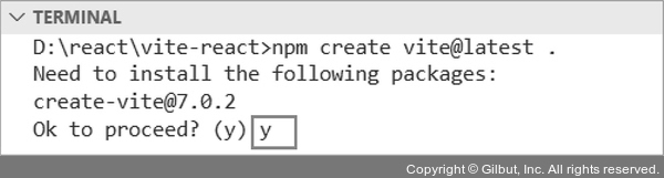 4 프로젝트 생성을 시작하면 다음과 같은 프롬프트(prompt)가 나타납니다. 이 메시지는 현재 컴퓨터에 create-vite 패키지가 없을 경우 나옵니다. 이때는 키보드로 y를 입력한 후 Enter 를 눌러 설치를 진행합니다. 이미 패키지가 설치되었다면 이 단계는 건너뜁니다.