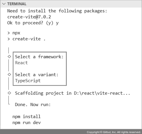 5 설치가 시작되고 추가 프롬프트가 나타납니다. 키보드 방향키를 사용해 React → TypeScript를 순서대로 선택합니다. 그러면 타입스크립트 환경이 자동으로 설정된 리액트 프로젝트가 생성됩니다. 이제 따로 설정을 추가하지 않아도 .tsx 파일로 리액트 코드를 작성할 수 있습니다.