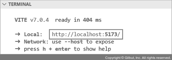 7 개발 서버가 정상적으로 구동하면 다음과 같은 로컬 주소를 출력합니다. 이때 주소는 개발 환경을 따르므로 책과 다를 수 있습니다. 서버가 정상적으로 실행되면 다음과 같은 메시지가 터미널에 표시됩니다.