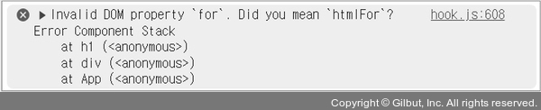 JSX에서 잘못된 속성을 사용하면 웹 브라우저의 개발자 콘솔에 경고 메시지가 뜹니다. 예를 들어 for 속성을 썼다면 리액트는 htmlFor로 바꾸라고 알려줍니다.
