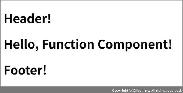 화면에는 세 개의 제목 텍스트가 순서대로(Header! → Hello, Function Component! → Footer!) 표시됩니다.