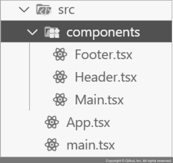 리액트 애플리케이션에서는 컴포넌트 파일을 보통 src 폴더 하위에 작성합니다. 개발자에 따라 src/components 폴더를 만들어 컴포넌트를 정리하는 경우가 많습니다. 이 책에서는 App.tsx를 제외한 모든 컴포넌트는 src/components 폴더 아래에 작성합니다.