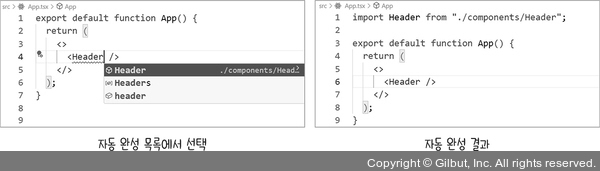 return 문 안에서 사용할 컴포넌트 이름(예 <Header />)을 먼저 작성합니다. 그리고 커서를 컴포넌트 이름 바로 뒤에 두고 단축키를 눌러 컴포넌트 목록을 불러옵니다. 단축키는 Ctrl + Space (윈도우) 또는 fn + control + Space (맥OS)입니다. 화면에 컴포넌트 목록과 파일 경로가 표시됩니다. 목록에서 해당 컴포넌트를 선택하면 import 문이 자동으로 작성됩니다.